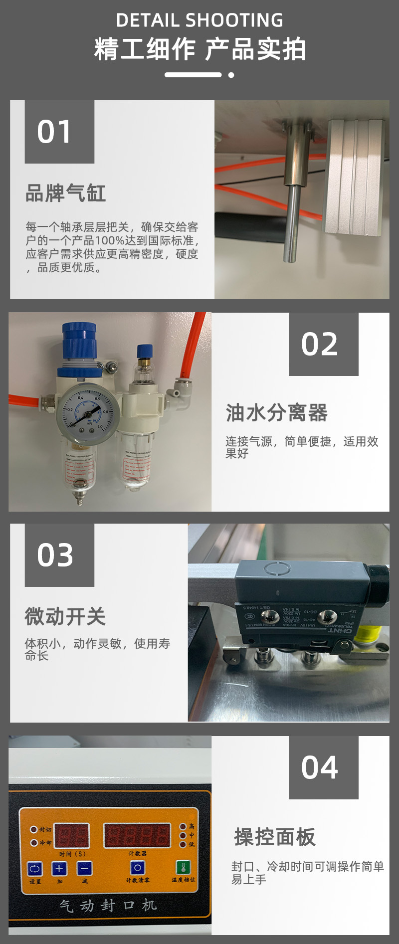 - 封口速度快:由于采用氣動驅(qū)動,封口速度快,能夠大大提高生產(chǎn)效率。
