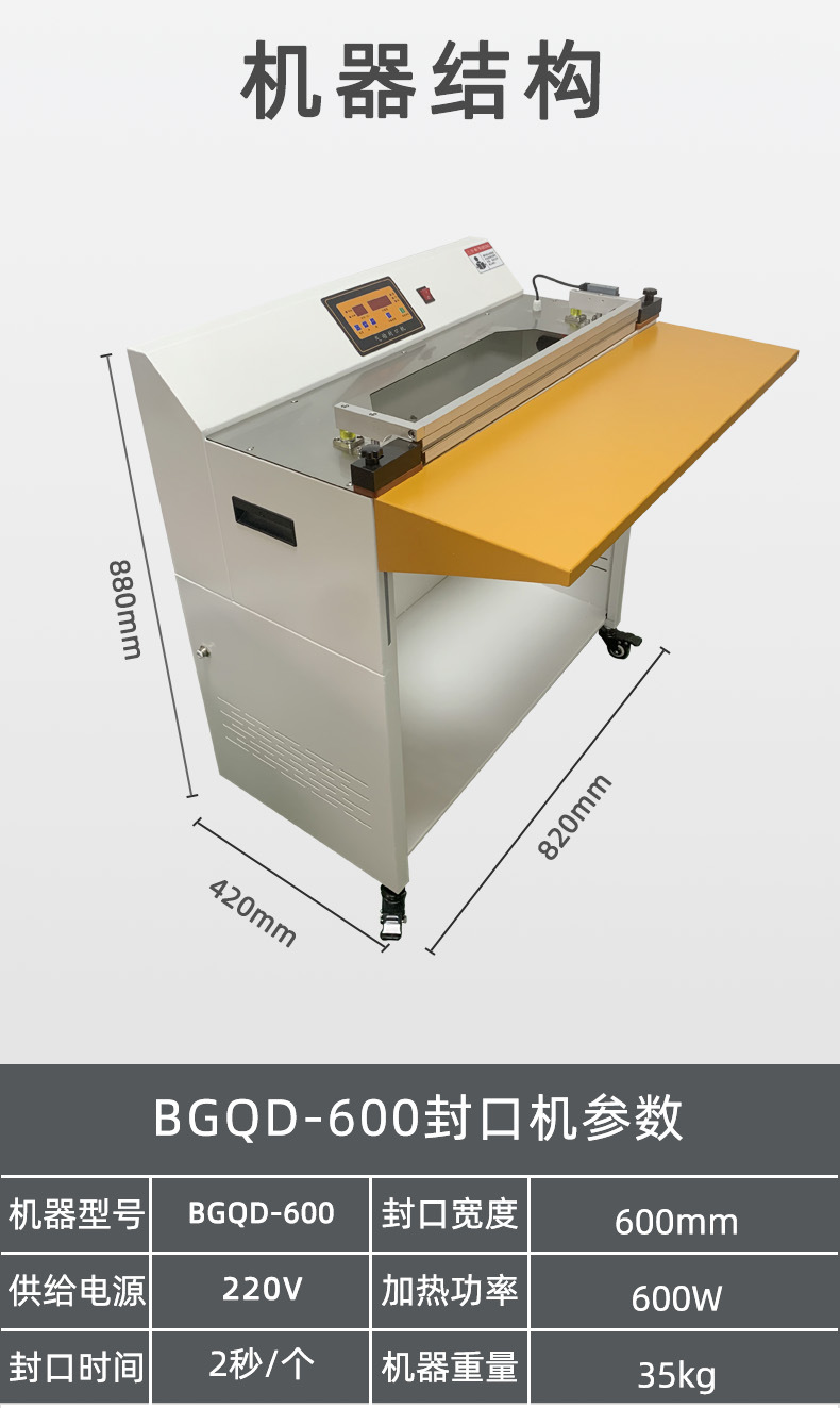 - 操作簡單:設(shè)備操作簡單,只需將包裝材料放置在封口位置,按下啟動按鈕即可完成封口操作。