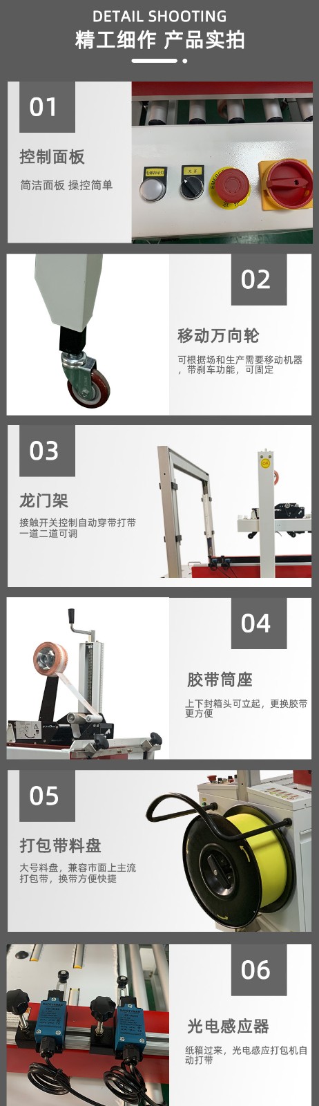 2. 打包部分:封箱后的箱子繼續(xù)向前移動(dòng),進(jìn)入打包區(qū)域。打包機(jī)自動(dòng)將打包帶纏繞在箱子上,并進(jìn)行拉緊、熱熔焊接等操作,將箱子牢固地打包在一起。
