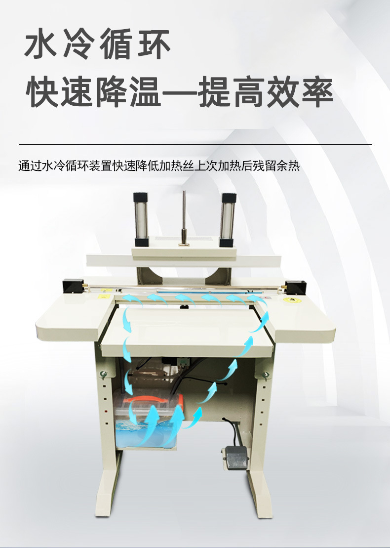 • 與普通封口機(jī)不同的是,水冷封口包裝機(jī)在下封口座內(nèi)設(shè)置了循環(huán)冷卻水管。在封口工作完成后,循環(huán)冷卻水在水管中流動(dòng),帶走加熱條的熱量,從而快速降低封口部位的溫度,縮短加熱條的冷卻時(shí)間,提高封口效率。