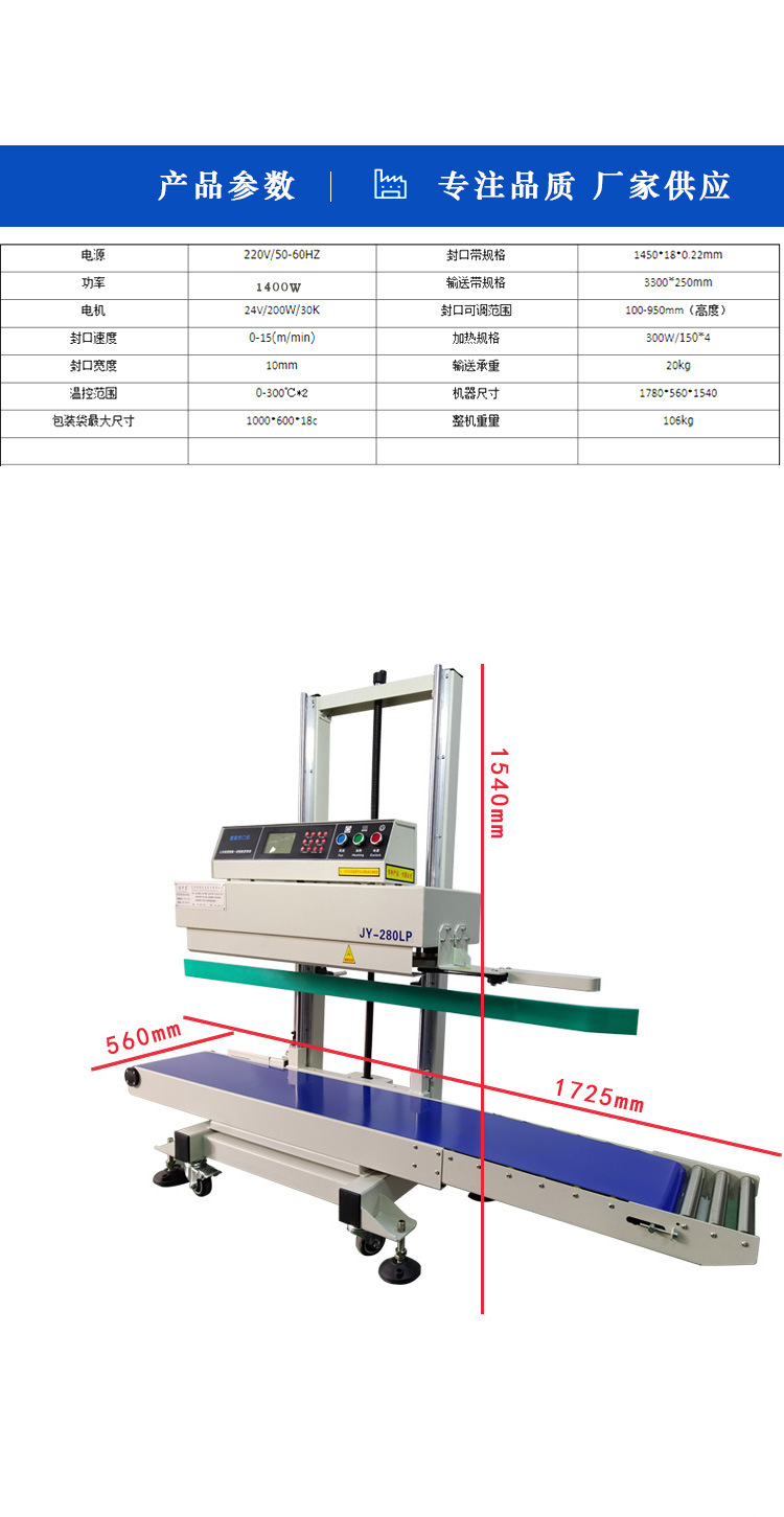 BG-280L大型立式連續(xù)式封口機(jī)載重大,可升降高度調(diào)節(jié),適用于大包裝大重量的裝袋封口包裝