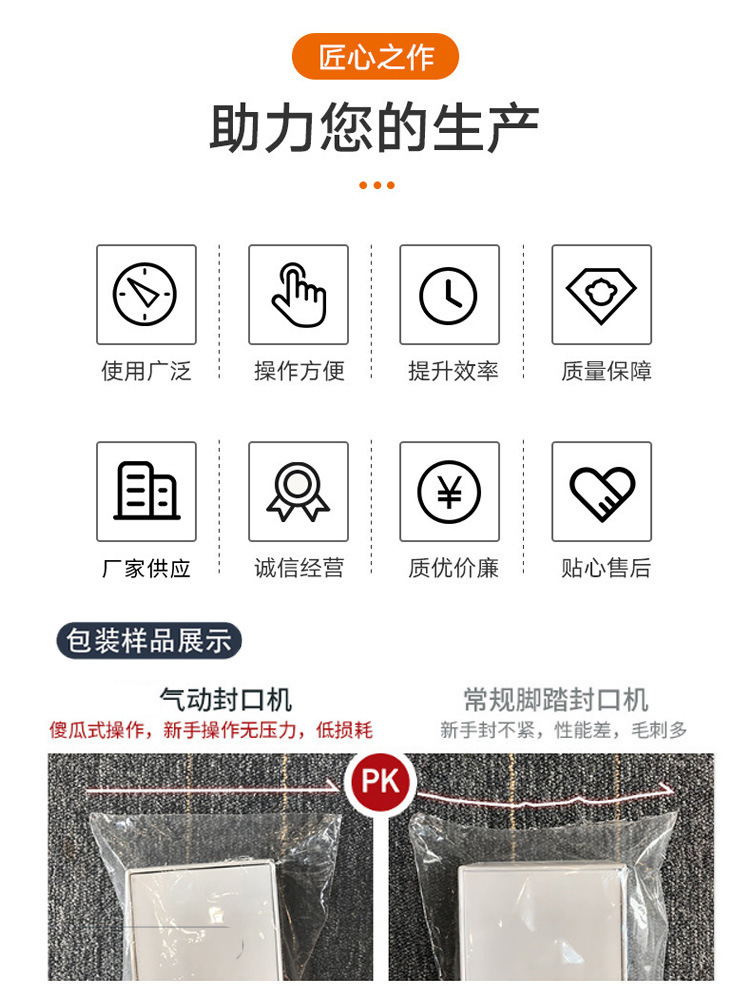 - 安全節(jié)能:一些腳踏封口機設(shè)有抽吸裝置,可處理加熱產(chǎn)生的煙氣,減少廢氣排放;工作完成后,將熱封溫度旋鈕逆時針旋轉(zhuǎn)最低打開封機開關(guān)拔掉插頭即可 。