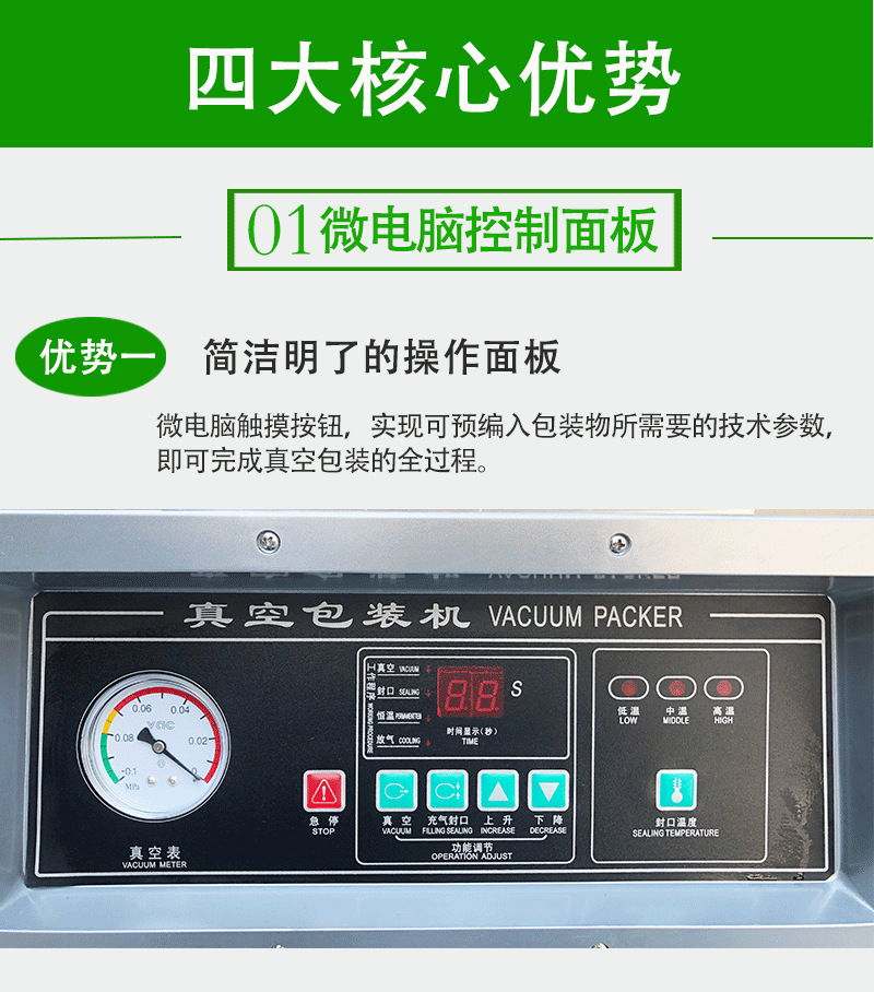 - 操作簡便:整體操作流程清晰易懂,只需把產(chǎn)品裝袋、放置好,在控制面板上設置幾個關鍵參數(shù),新手也能快速上手,無需復雜培訓。