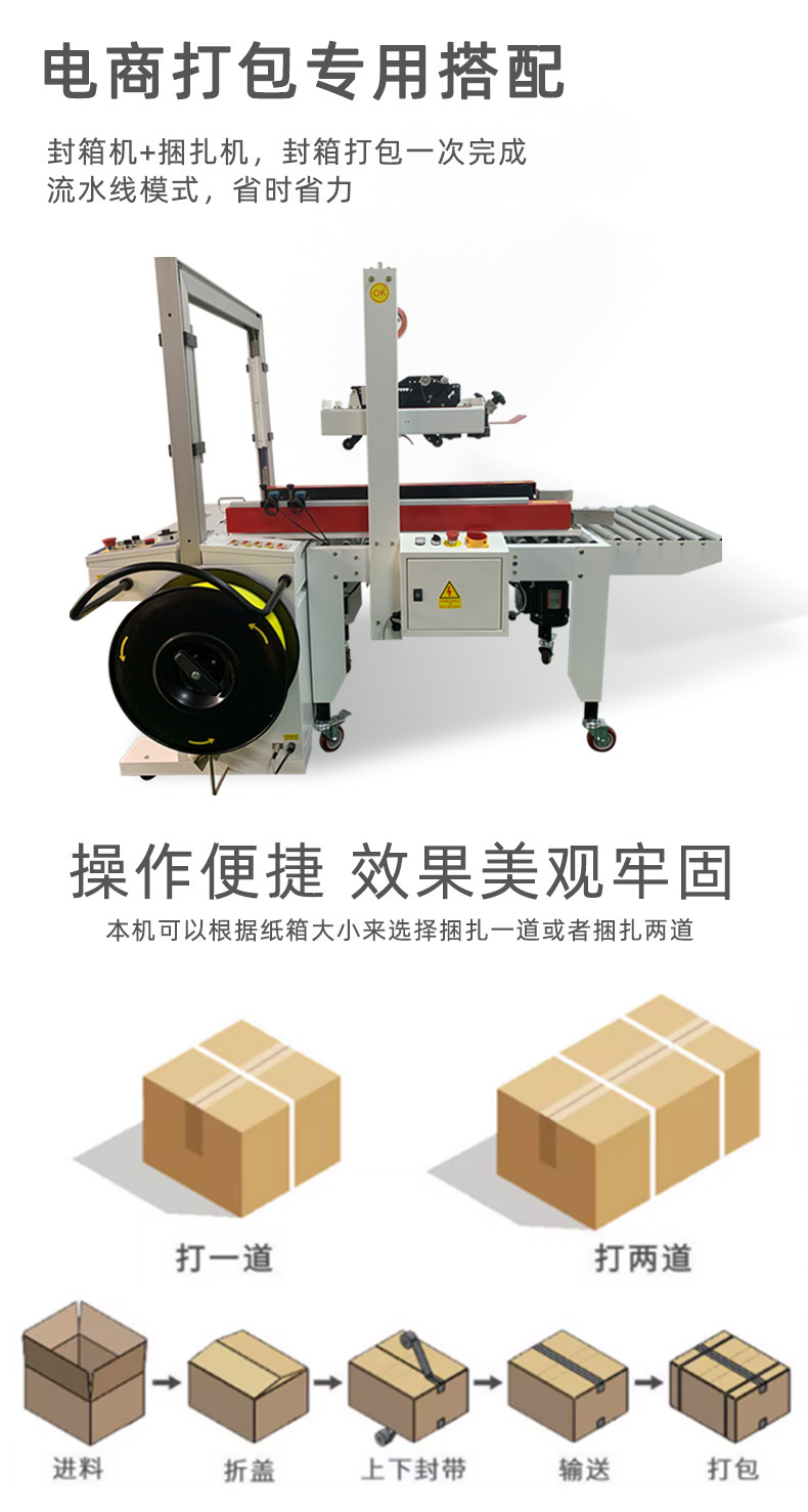 封箱打包一體機(jī)可自動調(diào)整打包帶長度和緊度,將多個產(chǎn)品打包成整體,便于運(yùn)輸存儲