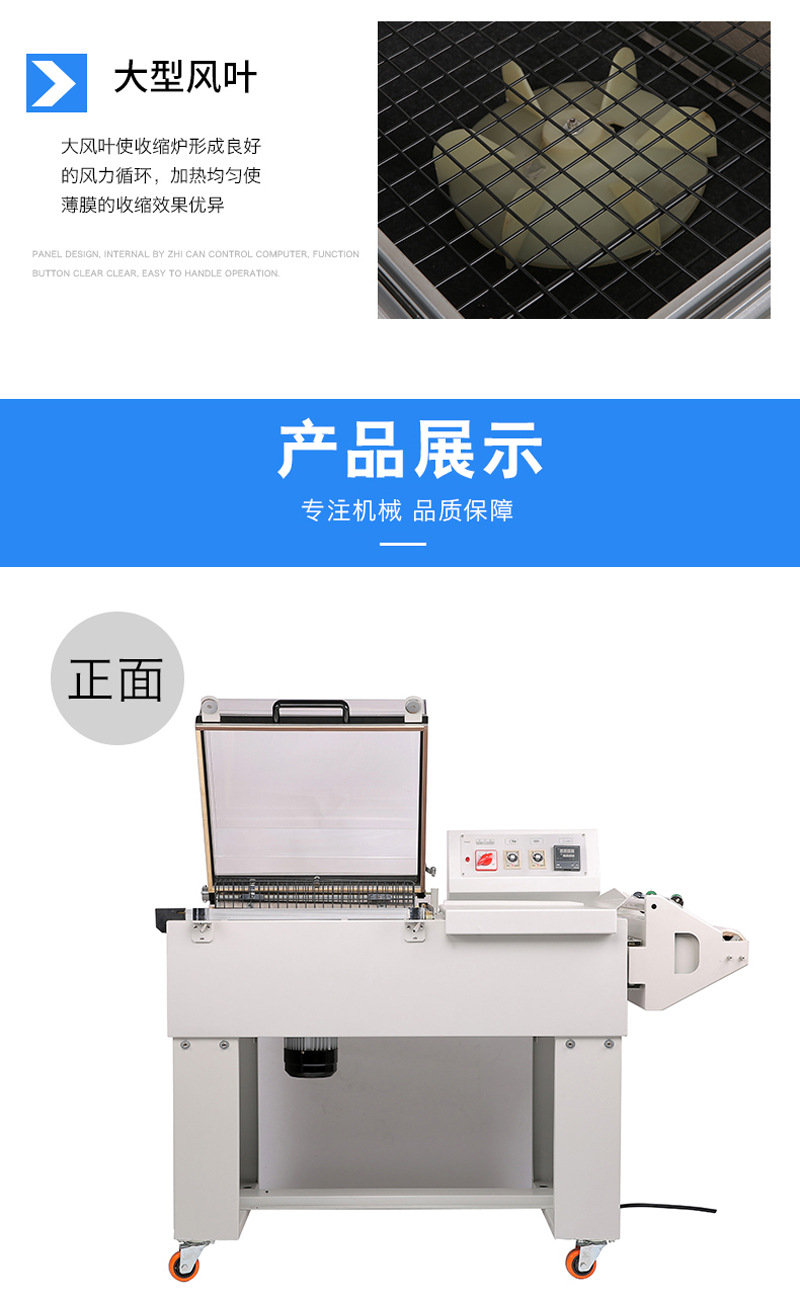 - 控制系統(tǒng):采用 PLC 編程控制,搭配觸摸屏操作界面,方便操作人員直觀設(shè)定、調(diào)整封切溫度、收縮溫度、輸送速度等關(guān)鍵參數(shù),還能預(yù)設(shè)多組工作模式,一鍵切換,滿足不同產(chǎn)品包裝需求。