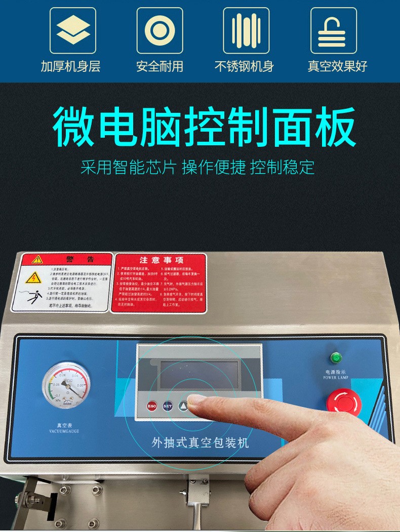 相較于單式內抽真空包裝機,氣動外抽真空包裝機優(yōu)勢顯著。在工作方式上,外抽式無需將產品放入真空室,直接在外部對包裝袋抽氣,可避免產品受真空室尺寸限制,輕松包裝大型或形狀特殊產品。在包裝效率方面,外抽式抽氣速度快,像食品外賣行業(yè),能快速完成餐食包裝,適應快節(jié)奏生產需求,而內抽式因真空室需密封、抽氣、恢復常壓等步驟,流程相對耗時