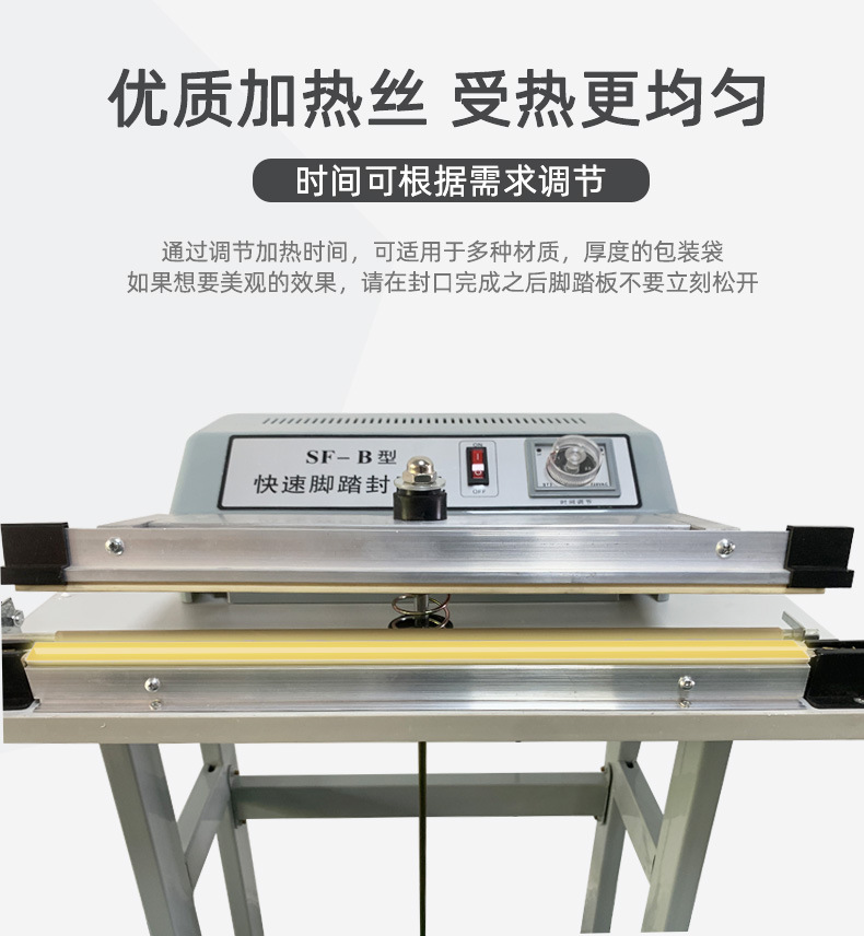 此外,?腳踏封口機(jī)還適用于各種塑料薄膜、?復(fù)合薄膜及鋁塑薄膜的封合,?廣泛應(yīng)用于食品、?土特產(chǎn)、?糖果、?茶葉、?醫(yī)藥、?五金等行業(yè)。?這種設(shè)備的操作簡單,?加熱時間可調(diào),?接通電源即可工作,?使得它在商店、?家庭、?工廠等環(huán)境中成為方便且經(jīng)濟(jì)的封口解決方案