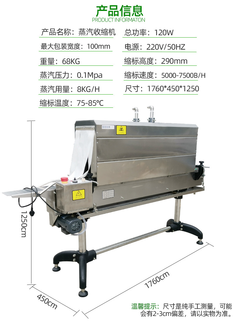 精準(zhǔn)控溫:能夠根據(jù)不同的包裝材料和產(chǎn)品需求,精確調(diào)節(jié)蒸汽溫度,確保收縮效果的一致性和穩(wěn)定性。比如在食品包裝中,對于不同材質(zhì)的保鮮膜,都能實現(xiàn)恰到好處的收縮,既保護了食品,又提升了外觀。