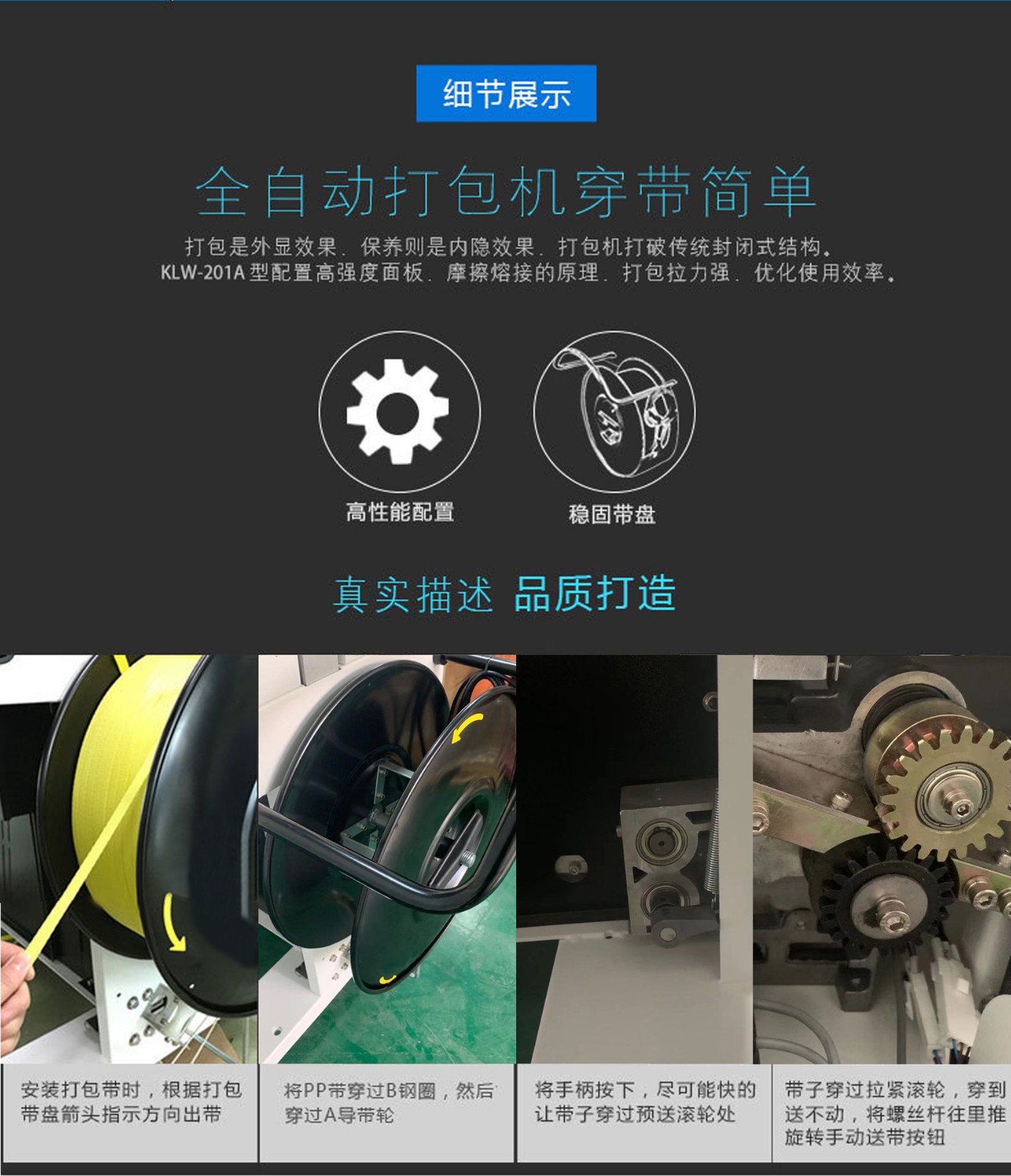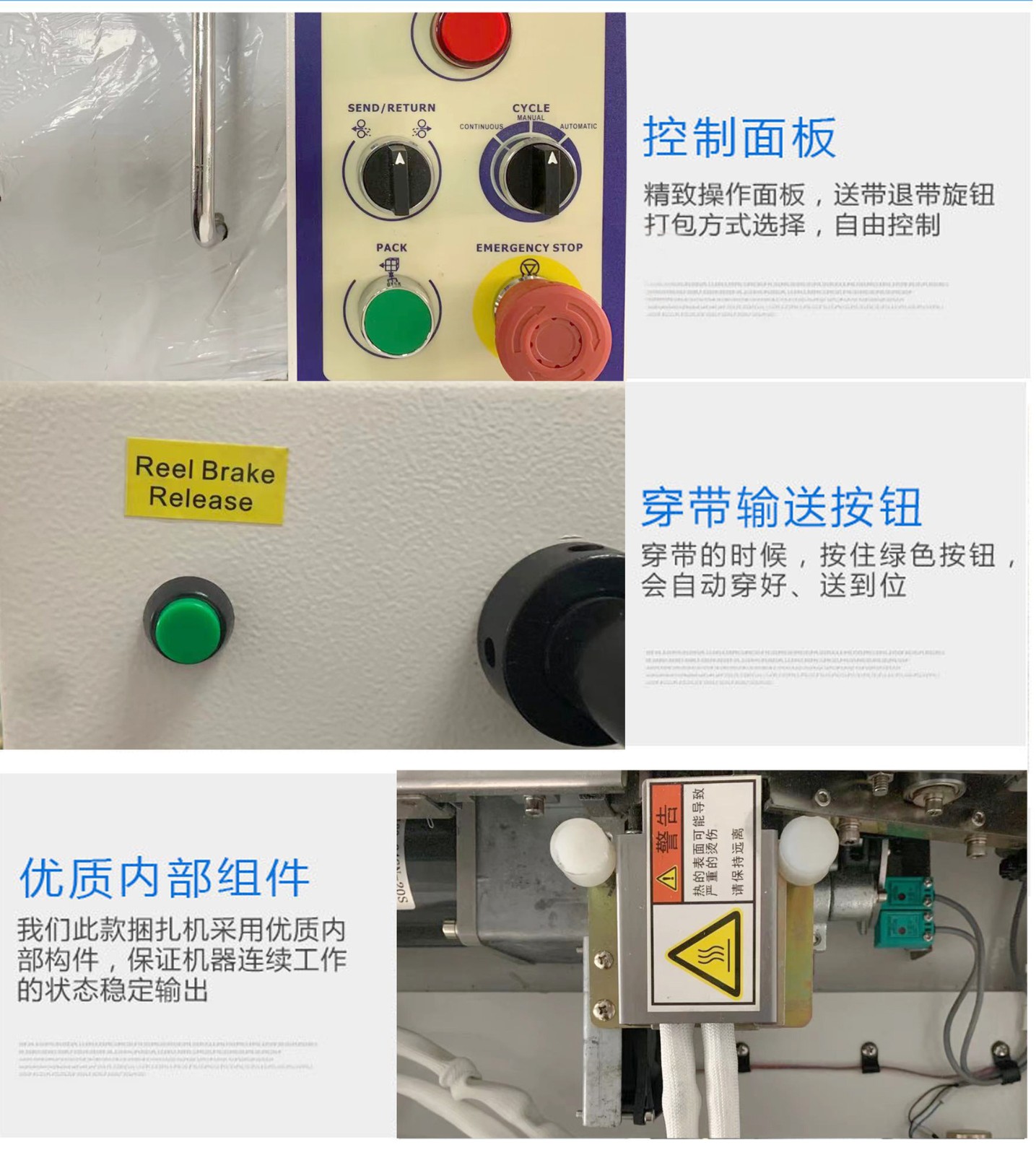 1. 送帶:將打包帶從帶盤上拉出,并輸送到打包位置。