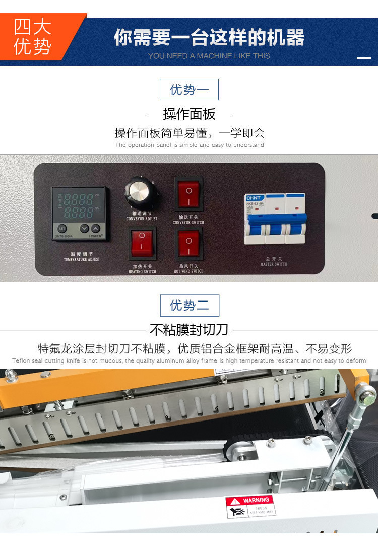 • 可以對(duì)傳送速度、封切溫度、封切時(shí)間、熱收縮溫度和時(shí)間等參數(shù)進(jìn)行設(shè)置和調(diào)節(jié)。操作人員可以通過控制面板輸入不同的參數(shù),以適應(yīng)各種產(chǎn)品和包裝材料的要求??刂葡到y(tǒng)還具備故障檢測(cè)和報(bào)警功能,能夠及時(shí)發(fā)現(xiàn)機(jī)器運(yùn)行過程中的問題,如溫度異常、傳送帶故障等。
