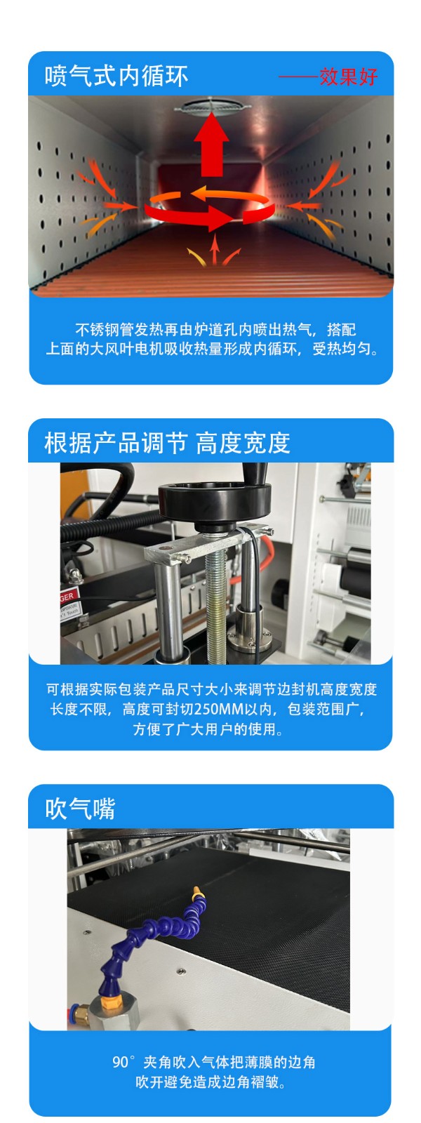 • 邊封完成后的產(chǎn)品被輸送到熱收縮通道。熱收縮通道內(nèi)的加熱元件(如電熱管或者紅外加熱裝置)開始工作,產(chǎn)生大量的熱空氣。通風(fēng)裝置會(huì)將熱空氣均勻地分布在通道內(nèi),使產(chǎn)品周圍的薄膜能夠均勻受熱。
