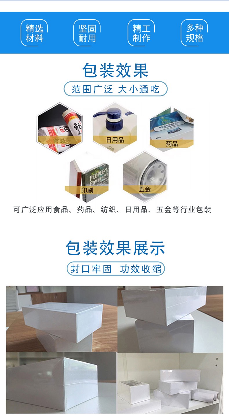 • 厚度:薄膜的厚度會(huì)影響邊封的溫度、壓力和時(shí)間等參數(shù)。較厚的薄膜可能需要更高的溫度和更大的壓力來進(jìn)行封口,而且在熱收縮過程中也可能需要更長的時(shí)間或者更高的溫度。因此,在選擇設(shè)備時(shí)要考慮其是否能夠滿足不同厚度薄膜的包裝要求。