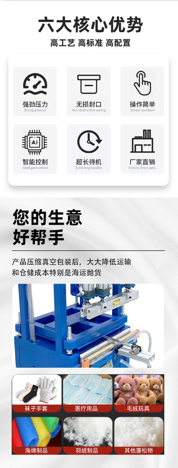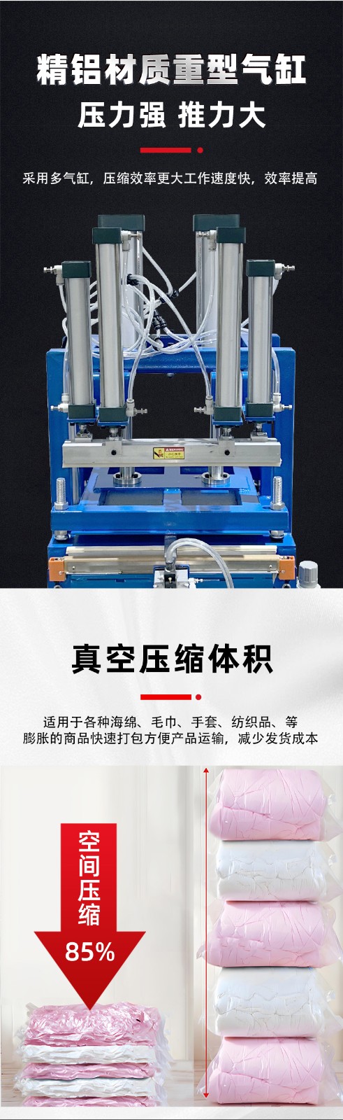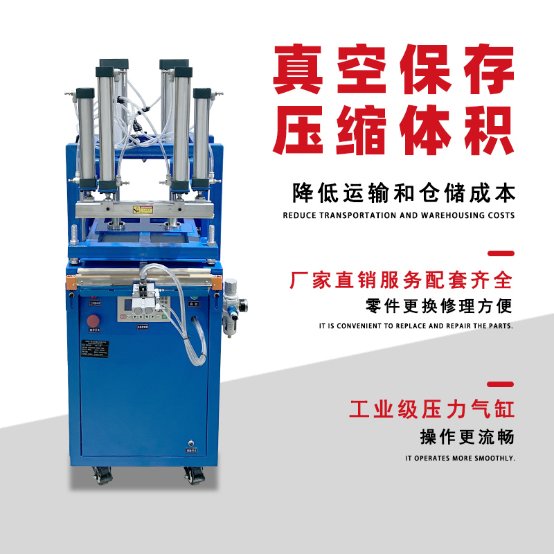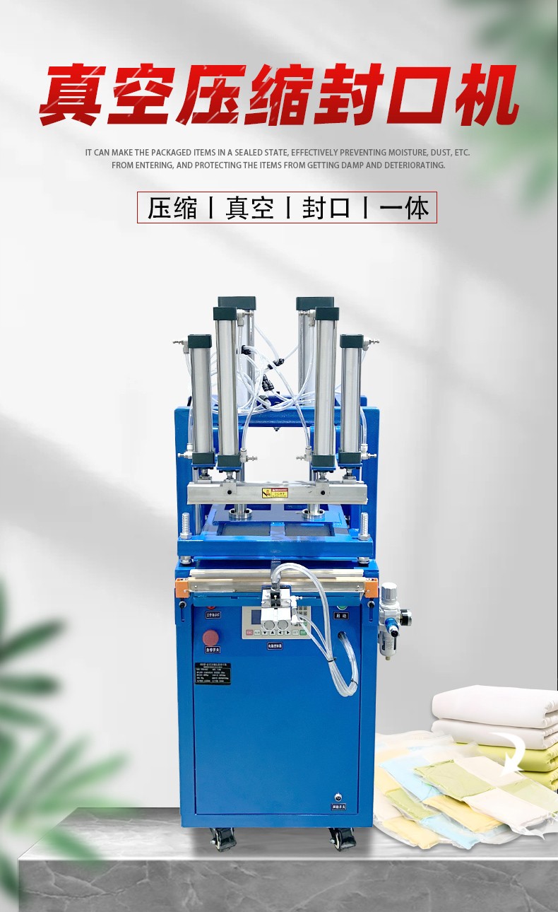 工作原理 抽氣:通過(guò)氣嘴或類(lèi)似裝置,利用真空泵對(duì)包裝袋內(nèi)的空氣進(jìn)行抽真空作業(yè),隨著包裝內(nèi)及被包裝物中的空氣被抽出,包裝袋體積減小,從而達(dá)到壓縮包裝物體積的目的。 封口:在抽氣完成后,通過(guò)封口作業(yè)將包裝袋口封牢,防止空氣回流,出現(xiàn)漲袋的問(wèn)題。 壓縮:部分機(jī)型還會(huì)采用氣缸壓縮產(chǎn)品的方式,將包裝袋內(nèi)的空氣進(jìn)一步排出去,使得包裝袋內(nèi)部形成 “偽真空狀態(tài)”,從而裹緊產(chǎn)品或包裝件。 性能特點(diǎn) 縮小包裝空間:能極大地縮小蓬松物品的包裝體積,降低儲(chǔ)藏運(yùn)輸成本。 延長(zhǎng)產(chǎn)品保質(zhì)期:包裝后的物品能達(dá)到密封、防潮、防污染等功能,