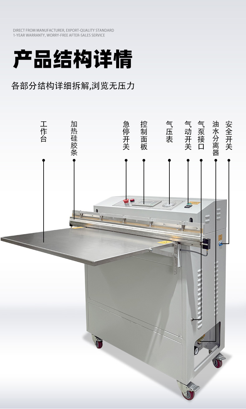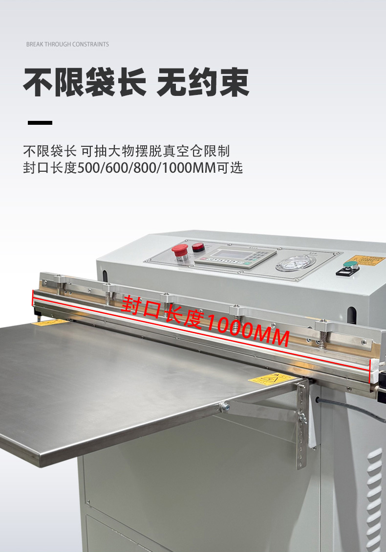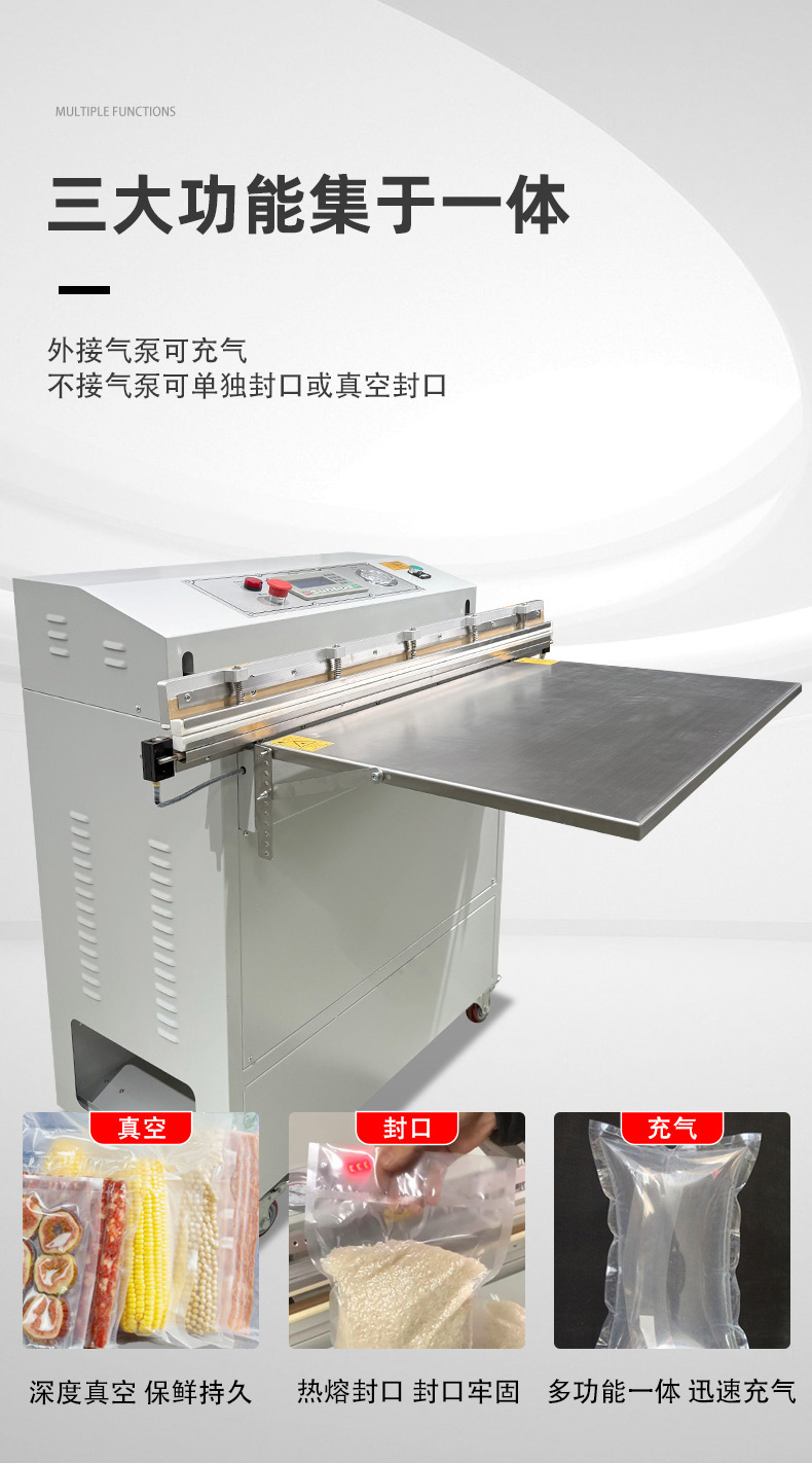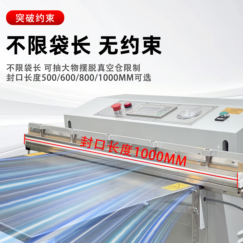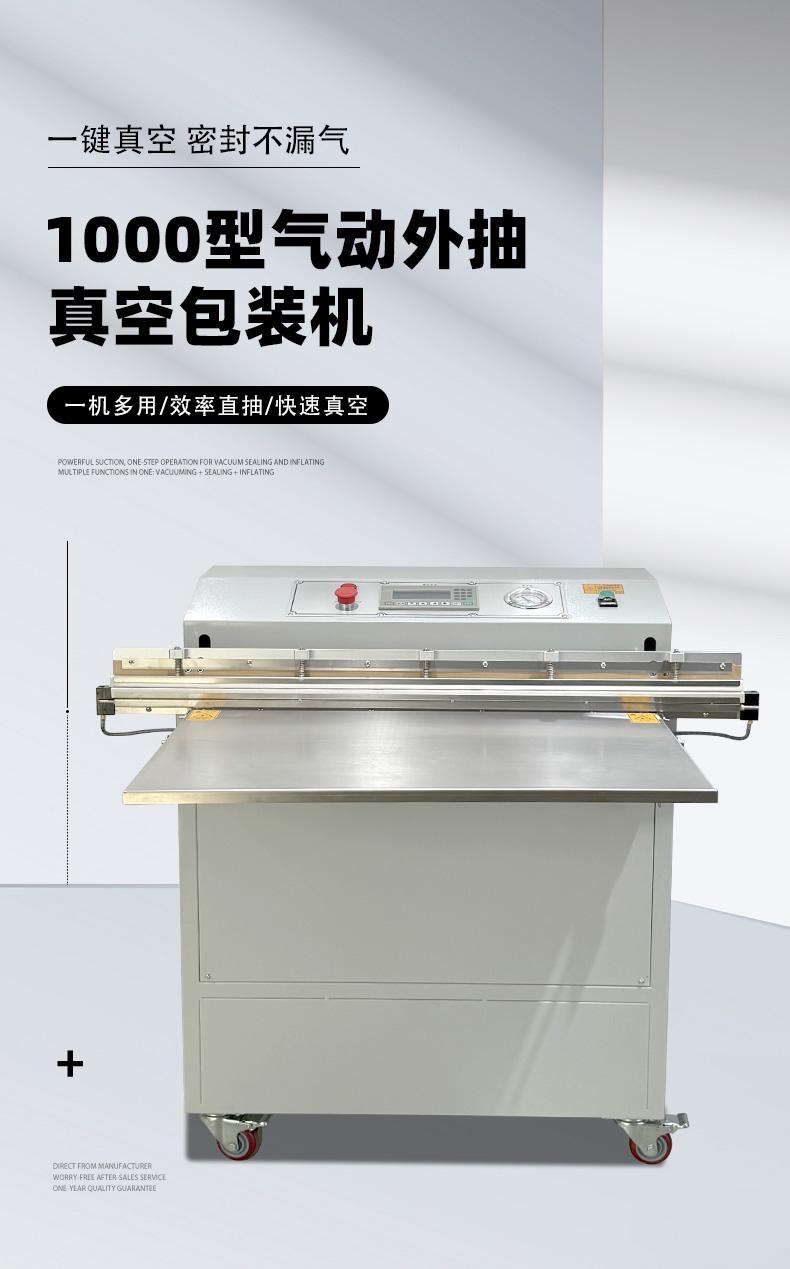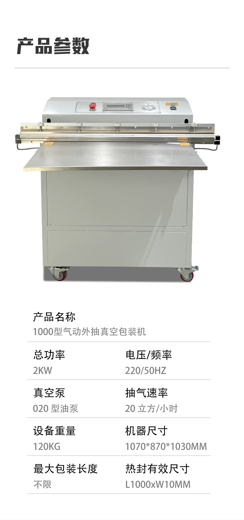 1000 型外抽真空包裝機(jī)是一款大尺寸外抽式真空設(shè)備,核心用于對(duì)體積較大、外形不規(guī)則或怕壓的物品進(jìn)行真空包裝,通過(guò)外部抽氣實(shí)現(xiàn)防潮、防塵、保鮮或防銹保護(hù)。 1. 核心特點(diǎn) 包裝尺寸大:“1000 型” 通常指其有效包裝寬度約 1000mm,可容納大件物品,如整箱零件、大型布料、家具配件、工業(yè)組件等。 外抽式設(shè)計(jì):抽真空組件在包裝腔外部,無(wú)需將物品完全放入密閉腔體內(nèi),能處理超出設(shè)備腔體尺寸的產(chǎn)品,也避免了內(nèi)抽式設(shè)備對(duì)易碎、怕壓物品的擠壓。 適配性強(qiáng):支持多種包裝材料,如 PE 復(fù)合膜、鋁箔膜等;可根據(jù)需求選
