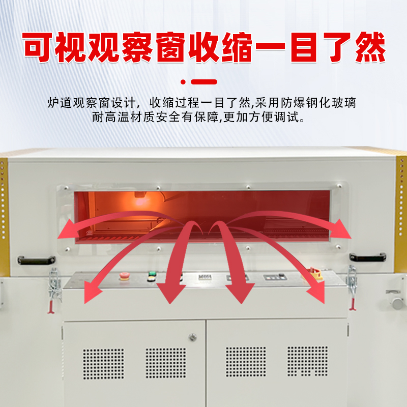 • 可視窗設計:設備設有可視窗,能夠讓操作人員清晰地觀察到收縮過程,便于及時發(fā)現(xiàn)和調(diào)整包裝過程中出現(xiàn)的問題,確保包裝質(zhì)量。