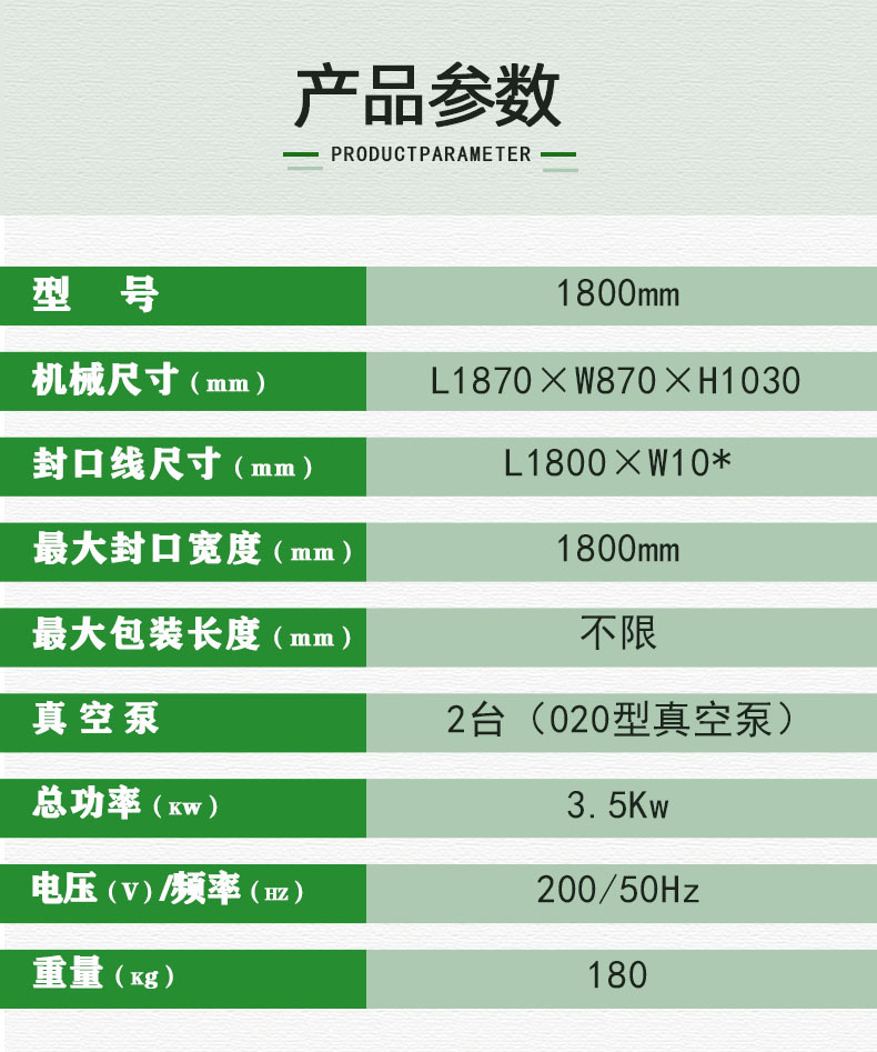 (1)包裝速度。出于提高生產(chǎn)效率的考慮,可選用雙室或多室的真空包裝機,以提高整個生產(chǎn)的進度。
