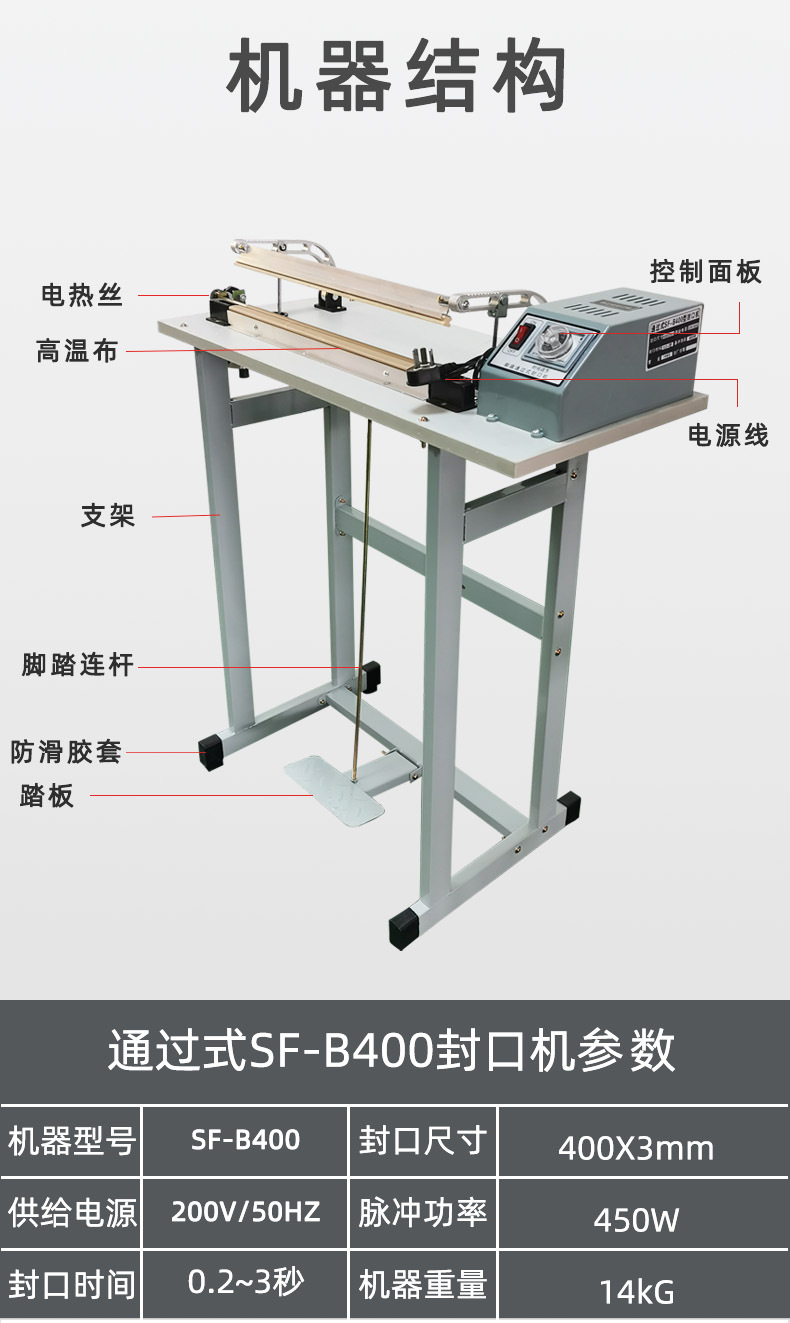 腳踏封口機是根據(jù)國內(nèi)外先進的機型基礎(chǔ)上,重新設(shè)計制造而成,適用于所有塑料袋薄膜封口及制袋,是食品廠,化妝品廠,藥廠等單位的理想封口設(shè)備。